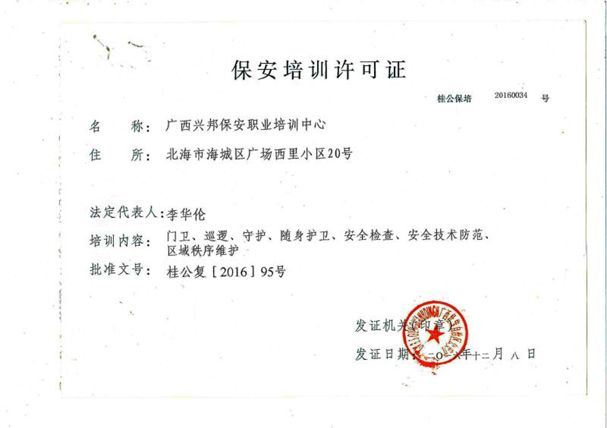 广西兴邦保安职业培训中心是人社厅、公安厅、财政厅、北海市公安局联合指定的保安职业培训机构,受自治区公安厅的高度重视。中心专业培养安全特卫,高级保安,私人保镖,中心成立于2016年,是为了满足广西安保市场对具有专业安防技术的高端安保人才的需求,经广西省公安厅、北海市公安局批准成立的新型的现代化的全民所有制企业。是具有现代管理体系的保安培训机构。